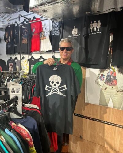 You may recognize the one and only king of stunts JOHNNY KNOXVILLE of JACKASS infamy, pictured here in a recent visit to Metropolis Vintage! He obviously has the best in bad taste as he was also featured in the John Waters film “A Dirty Shame”. Luckily, the man has survived long enough to visit our store and seemed to get a kick out of finding this classic Jackass tee amid the racks. Best of all, no one was harmed while taking this photo, especially Johnny Knoxville!